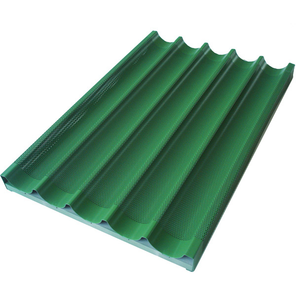 Pekač aluminijasti 400x600 mm perforiran valovit. Perforiran pekač omogoča lažji prenos toplote na proizvod. Valovit pekač je namenjen pečenju ozkih in podolgovatih proizvodov (npr. francoske štruce).
